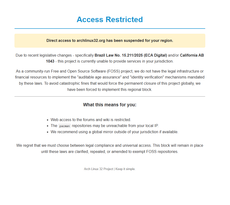 Um projeto comunitário como o Arch Linux 32 preferiu bloquear acesso regional a assumir risco jurídico e operacional que ele claramente não tem como bancar. O texto do aviso é brutal porque é honesto: FOSS pequeno não tem estrutura legal nem caixa para implementar mecanismo “auditável” de age assurance e identity verification sem correr risco existencial. Já o Reddit, no seu print, deixa claro o efeito colateral previsível: restrição adicional de contas, suspensão de acesso para parte dos usuários e ampliação da verificação etária. Quando a lei é desenhada sem levar em conta custo de implementação, quem não tem departamento jurídico sai do mercado ou fecha a porta para o Brasil.