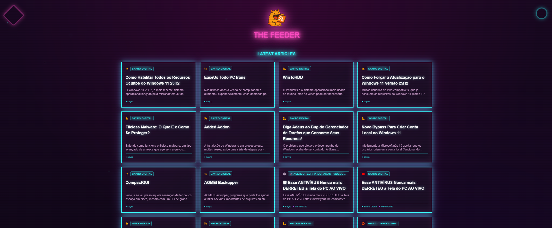 O The Feeder nasceu de uma ideia simples: criar uma forma prática e elegante de compartilhar meus feeds em um só lugar. O projeto, robusto e intuitivo, conquistou a comunidade de devs e promete crescer com novas melhorias e integrações.